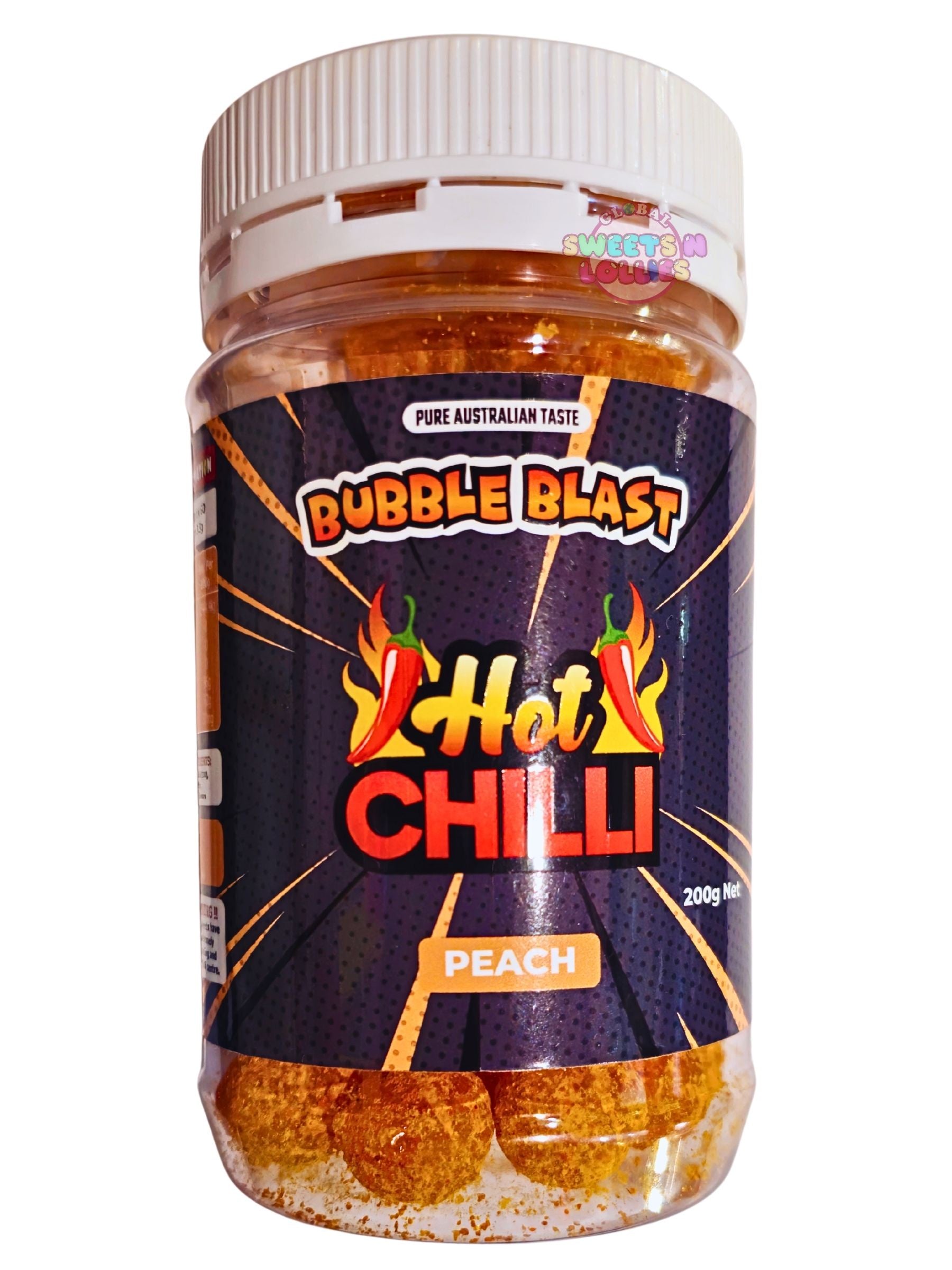 "Bubble Blast Hot Chilli Peach 200g" appears to be a type of rock candy that combines the sweetness of peach with a spicy chili kick.
