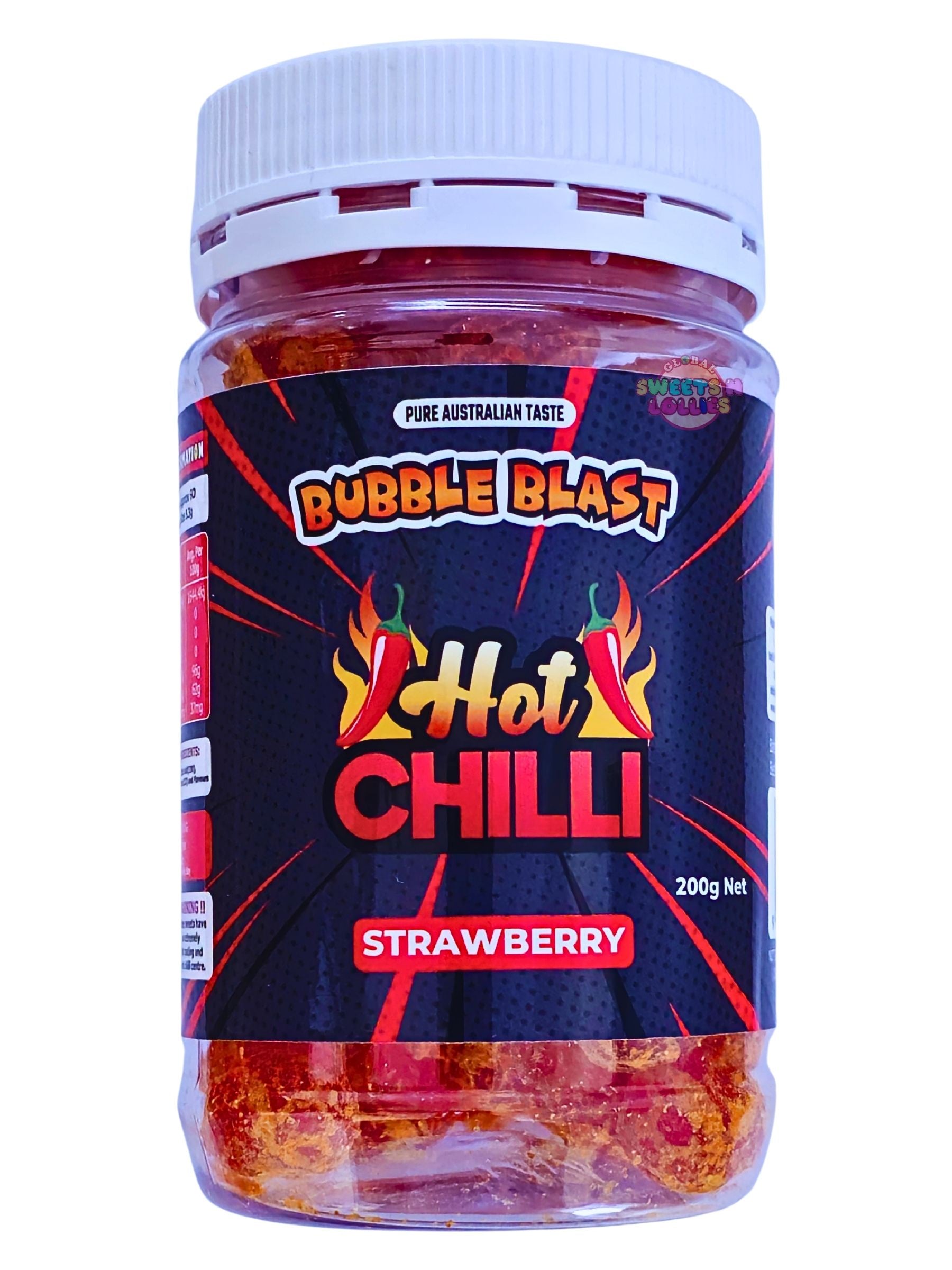 "Bubble Blast Hot Chilli Strawberry 200g" refers to a specific type of hard candy that combines sweet strawberry flavor with a hot chilli kick.