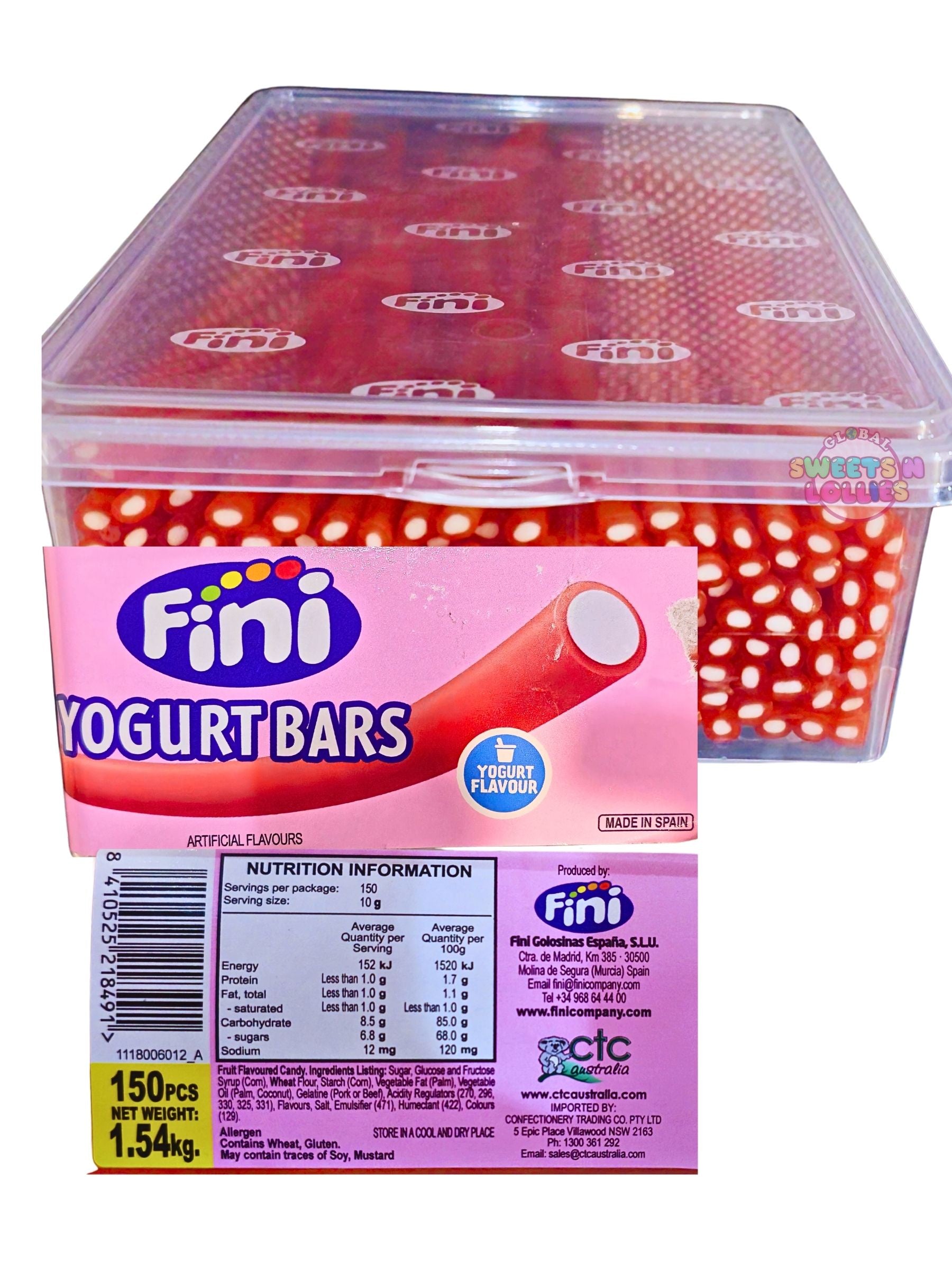Fini Yoghurt Bars, typically sold in tubs containing approximately 150 pieces, are a popular chewy candy. They feature a fruit-flavored outer laye with a creamy, white "yogurt" flavored filling. These bars are known for their soft texture and the balance between the tangy fruit and the sweet, creamy center.
