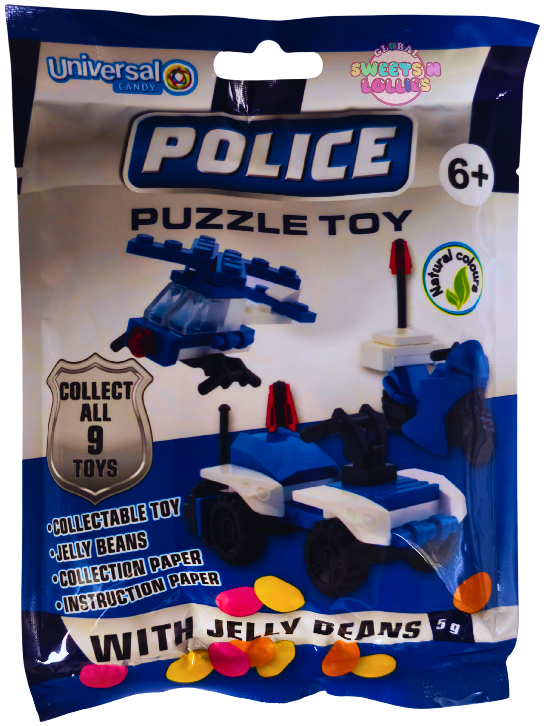 Unleash hours of fun and creativity with the Police Puzzle Toy w Candy 5g! This exciting product combines the thrill of building a mini police-themed puzzle with the sweet delight of jelly beans. Perfect for kids aged 6 and above, it’s a delightful mix of entertainment and tasty treats.