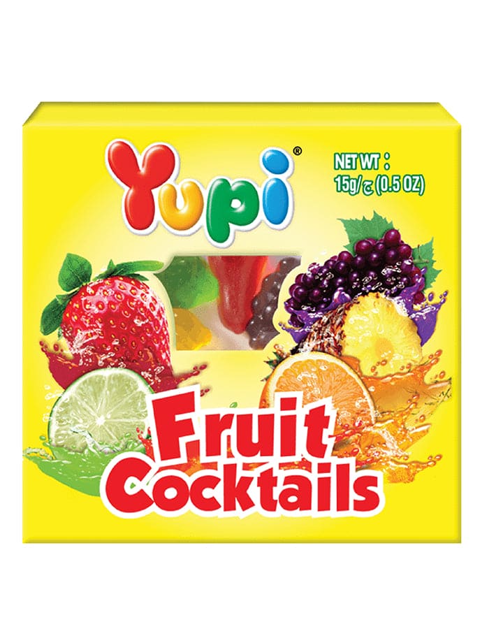 Open up a delicious medley of fruity fun with Yupi Fruit Cocktails. This convenient 30g bag is a vibrant assortment of adorable, fruit-shaped gummies, from sweet strawberries to tangy oranges. Each piece has Yupi's signature soft and satisfying chew, bursting with the fresh taste of a classic fruit salad. It’s a colourful and playful treat. It’s a perfect party of different fruit flavours, but the secret recipe for this particular 'cocktail' mix is a sweet little Yupi secret.